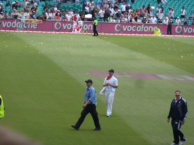 England were three wickets away from ending 24 years of pain Down Under and taking an Ashes series 3-1. Day five was threatening showers, but even this couldn't help Australia now. I'm going to give the stewards at the Sydney Cricket Ground some well deserved credit, as well as the Barmy Army people. If the steward hadn't seen you in the previous four days, you weren't allowed to sit with Bay 11. Someone had taken my seat, so I sat next to my Ipswich Town supporting friend. It was still a great view and there was no inflatable swan in my way this time.