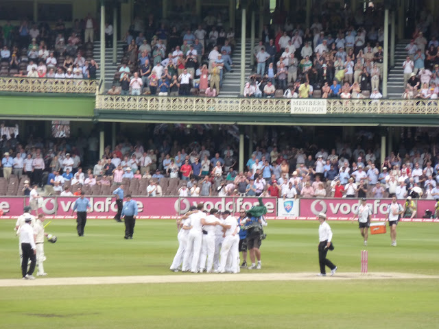 England fans were waiting for the inevitable and were enjoying it. Any England player that stood near us was serenaded. Nasser Hussain gave us a wave. When Strauss went to retrieve a ball from the boundary, he was greeted with huge cheers. However, like in Melbourne, Siddle put up resistance and Steve Smith actually batted well for the first time ever. Their partnership got bigger and bigger until Siddle finally mistimed one and this happened: